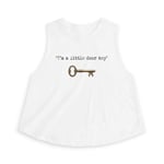Light, playful, and quietly clever — this cropped tank slips into warm-season wardrobes with easy confidence. The soft, extra-light fabric feels barely there on sunny days and layered evenings. A vintage key illustration and the whimsical text “I’m a little door key” sit centered across the chest, giving the top a wink of nostalgia and personality. The raw-cut sleeves and relaxed silhouette create a casual, breezy look that moves with you — whether you’re wandering markets, sipping coffee at a sidewalk table, or lounging at home. Built with a ribbed collar that keeps its shape and a tear-away label for comfort, this crop blends comfort and character for those who favor understated, story-driven pieces.